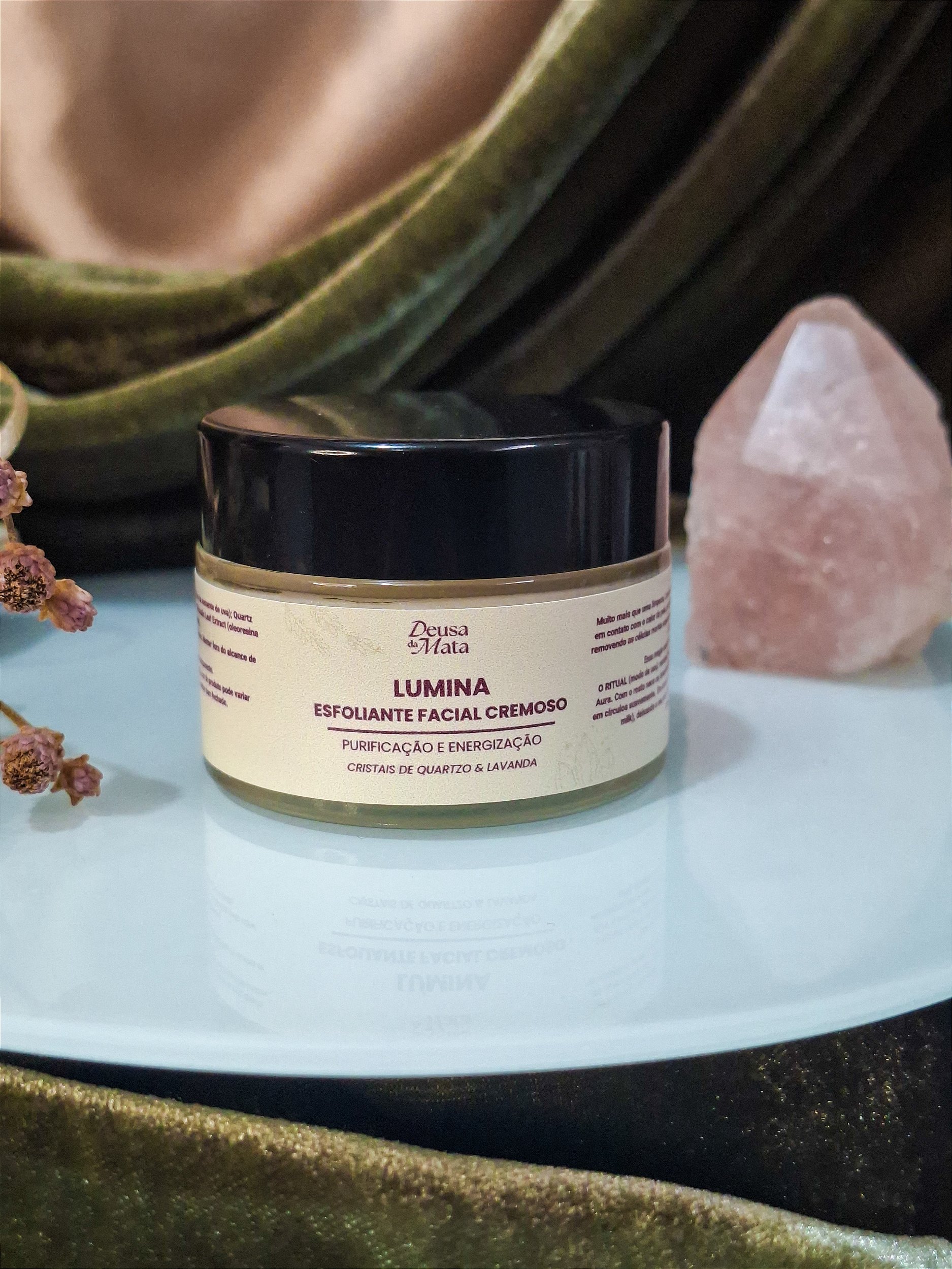 Lumina é uma jóia de cuidado. Um esfoliante cremoso, sua textura derrete em contato com o calor da pele, permitindo que os cristais de quartzo esfoliem o rosto com suavidade, removendo as células mortas enquanto as manteigas e óleos nutrem e acalmam. E depois, a magia: em contato com a água, o creme se transforma em uma loção leitosa nutritiva, deixando seu rosto com um toque de pétala. O resultado é uma pele com textura macia e uniforme. Muito mais que uma limpeza, Lumina é um ritual de renovação sensorial.